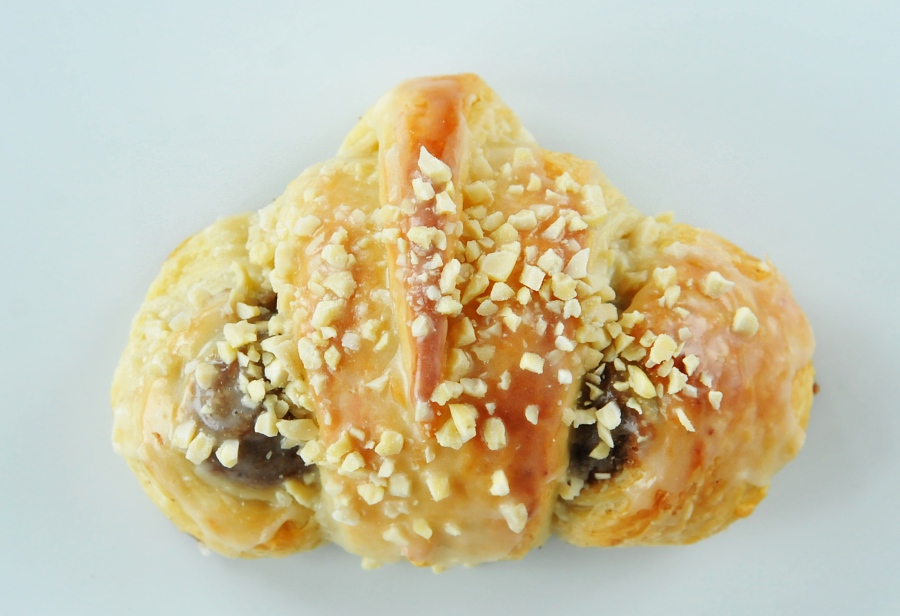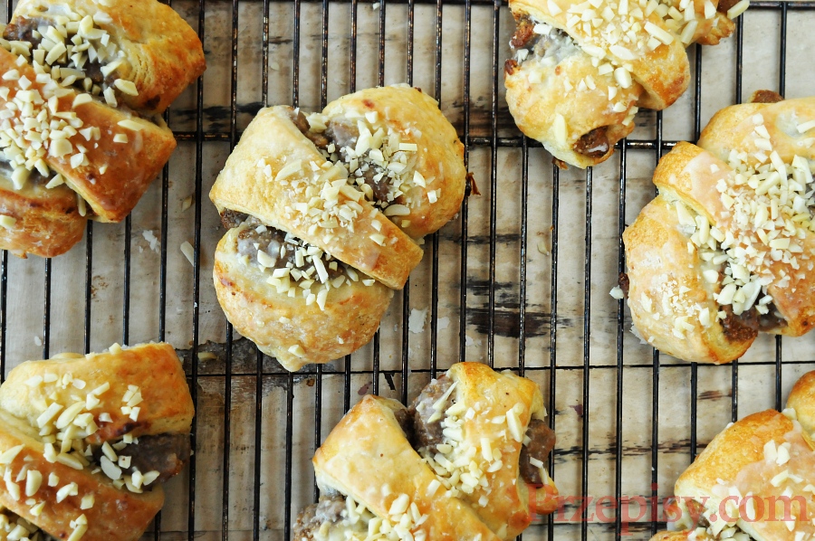 Gotowe ciasto rozwałkowujemy na długi cienki płat o szerokości 25 cm. Z ciasta wycinamy podłużne trójkąty, nakładamy równomiernie masę, zostawiają wolne miejsce po bokach i w szczycie trójkąta. Każdy trójkąt z masą dokładnie rolujemy zaczynając od najszerszego miejsca formując kształt rogala.