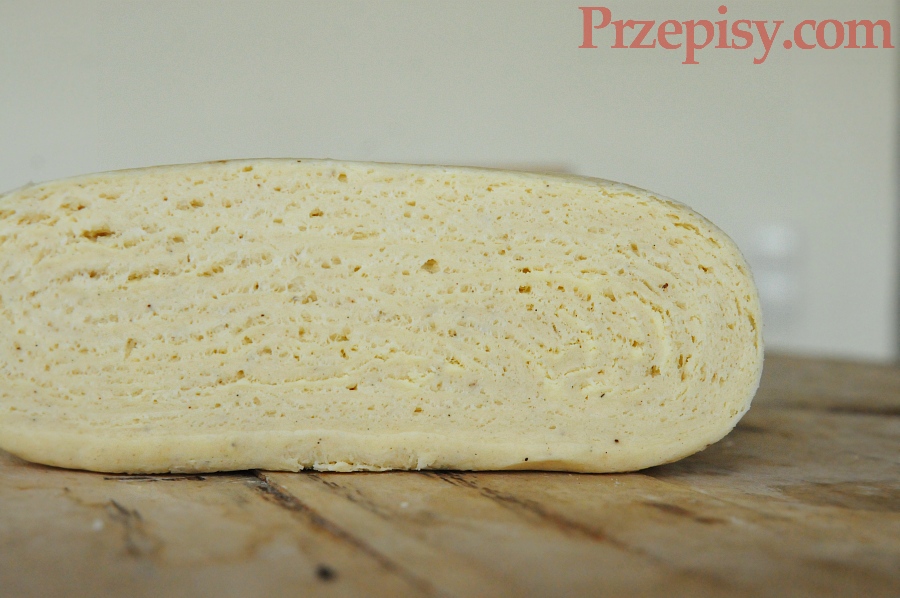 Do miski wlewamy szklankę ciepłego mleka, dodajemy drożdże, mieszamy aż całkowicie się rozpuszczą. Dodajemy jajko, ekstrakt z wanilii i ponownie mieszamy. Odstawiamy na kilka minut. Do osobnej miski przesiewamy mąkę, dodajemy sól i cukier i całość mieszamy. Dodajemy 2 łyżki masła i rozcieramy palcami z mąką. Dodajemy nasz rozczyn drożdżowy, dokładnie mieszamy do połączenia składników. Ciasto przekładamy na stolnicę i wyrabiamy krótko i delikatnie.