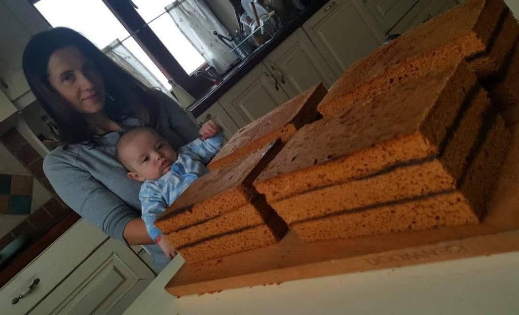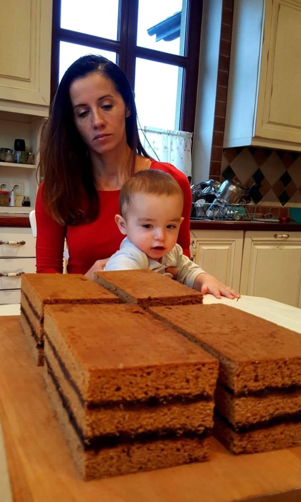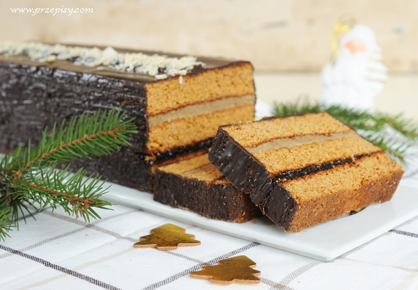 Po 2 tygodniach ciasto dzielimy na trzy części i każdą wałkujemy, układamy na blachy (25×35 cm) i pieczemy około 40 minut w 220 stopniach. Po wyjęciu układamy na dużej drewnianej desce lub stolnicy: dolny blat ciasta, na nią dżemy; potem środkowy blat i masa orzechowa (przepis jak do mazurka, ale z połowy porcji) i na samą górę ostatnia warstwa piernika. Całość przykrywamy papierem do pieczenia i na górę kładziemy kilka dużych, ciężkich książek, które spowodują, że po 3–4 dniach ciasto będzie równe, ściśnięte i odpowiednio sklejone.