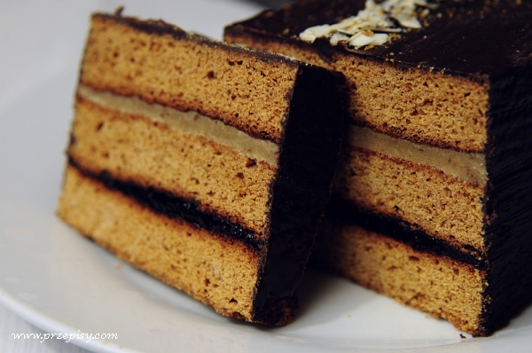 Po tym czasie kroimy wzdłuż na dwa długie prostokąty i oblewamy czekoladą rozpuszczoną w niewielkiej ilości kremówki.